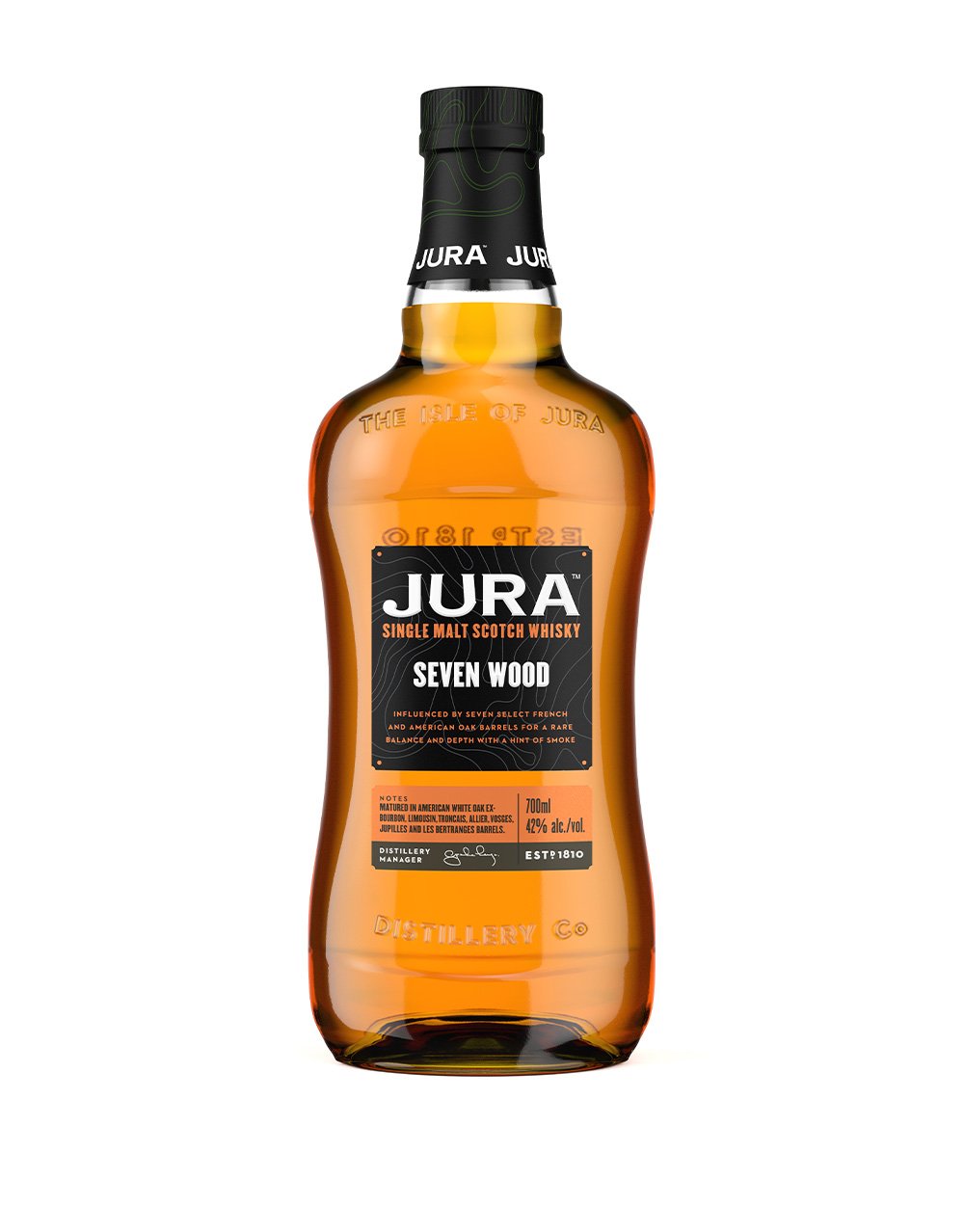 Jura Seven Wood Single Malt Scotch whisky is crafted from seven different oak cask types – first-fill ex-Bourbon American White Oak, Vosges, Bertranges, Jupilles, Allier, Tronçais & Limousin barrels. Our master blender applies his deep knowledge of wood to enhance the wood's natural qualities and create a harmonious complexity of flavour in Seven Wood.