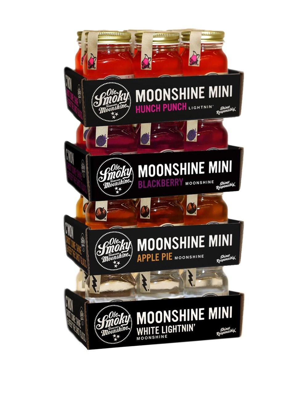 Includes: 1 pack of Ole Smoky® Blackberry Moonshine Minis (6x50ml), 1 pack of Ole Smoky® Apple Pie Moonshine Minis (6x50ml), 1 pack of Ole Smoky® Hunch Punch Moonshine Minis (6x50ml), and 1 pack of Ole Smoky® White Lightnin’ Moonshine Minis (6x50ml)